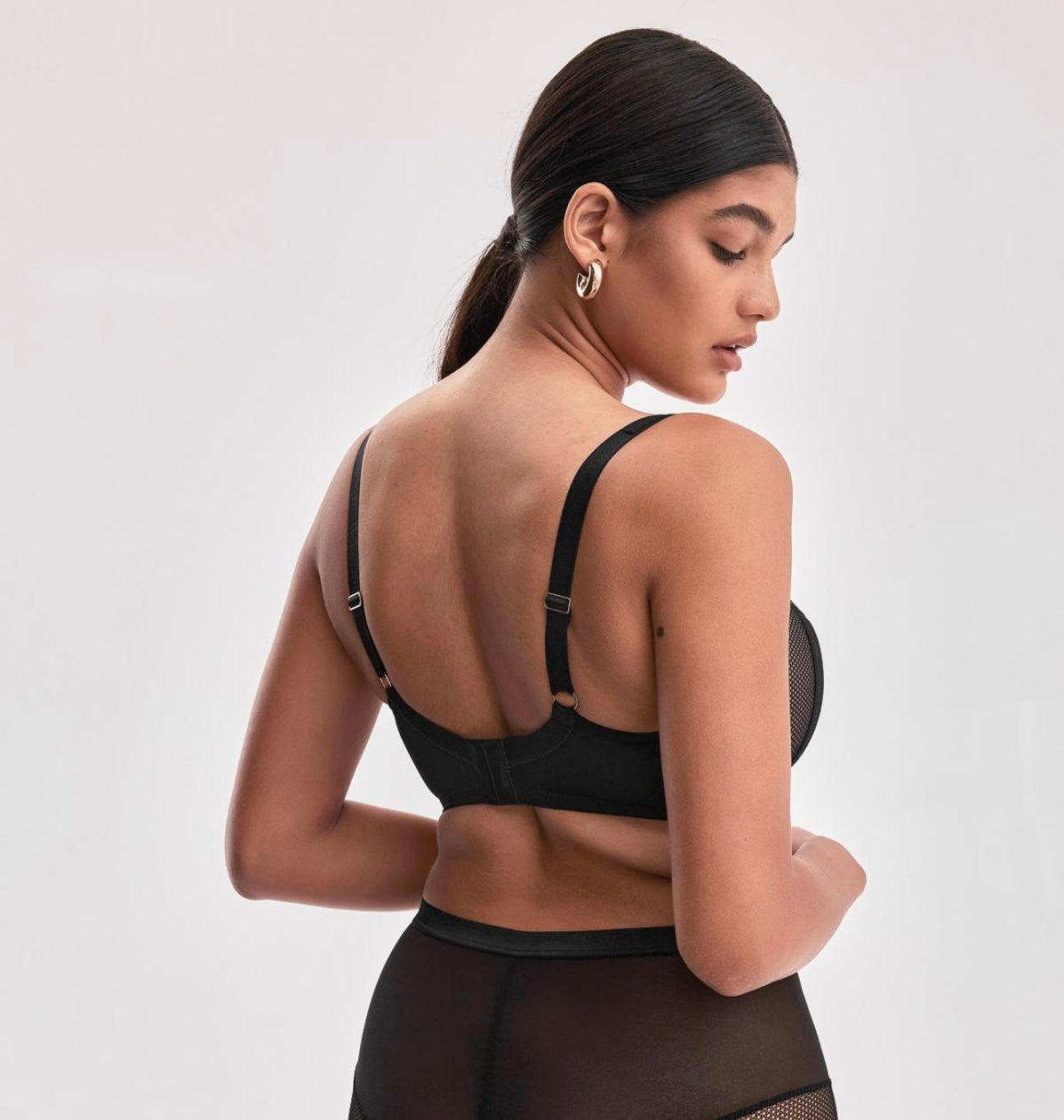 A semi-soft bra designed for medium and large breasts, made of black elastic plain and modern lace.
